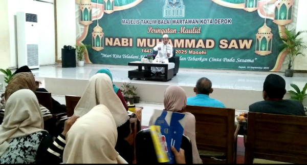 Dengan mengangkat tema ‘Mari Kita Teladani Akhlak Rasulullah dan Tebarkan Cinta pada Sesama’, Majelis Taklim Balai Wartawan Kota Depok menggelar peringatan Maulid Nabi Muhammad SAW dan Santunan Anak Yatim yang berlangsung di Gedung Balai Rakyat Depok 1, Jl. Bangau Raya, Depok, Kamis (25/09/2025).